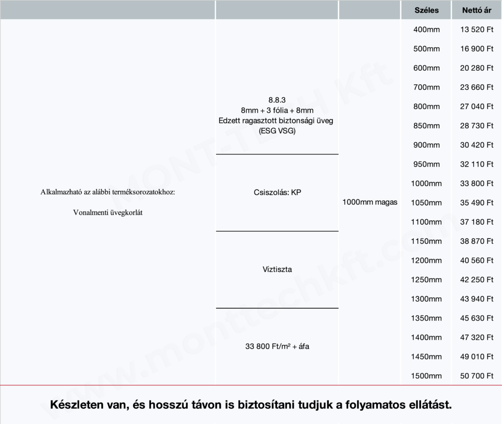 8.8.2 (8+8 mm) Edzett ragasztott biztonsági üveg (ESG VSG) 1000 mm magas – Víztiszta