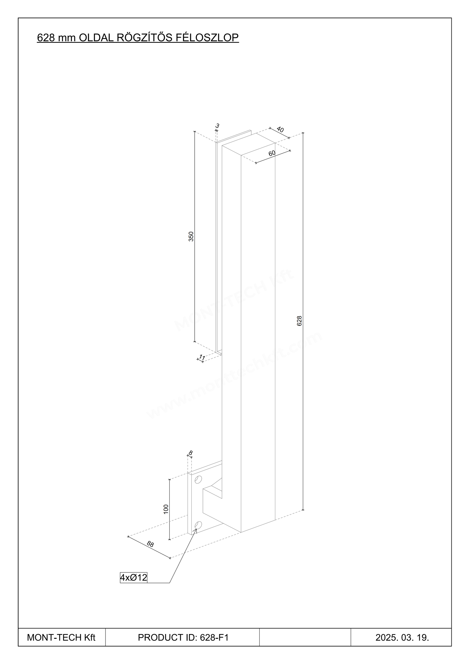 628 mm Féloszlop, oldalról rögzített (rozsdamentes acél)